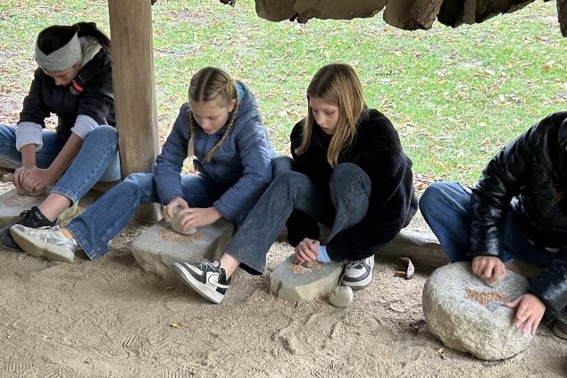 Am Mittwoch, dem 22. Oktober, besuchten die Klassen 2a und 2b im Rahmen des Geschichteunterrichts das MAMUZ in Asparn/Zaya. Bei einer spannenden Führung durch das Freigelände durchliefen die Schülerinnen und Schüler die wichtigsten Epochen der Vorgeschichte — von Altsteinzeit über Jungsteinzeit bis hin zurMetallzeit. Sie besichtigten rekonstruierte Gebäude, lernten verschiedene historische Berufe kennen und erfuhren, wie Menschen damals lebten, arbeiteten und welche Werkzeuge sie verwendeten. In den anschließenden Workshops wurde Geschichte praktisch erfahrbar gemacht. Beim Brotbacken wurde der gesamte Ablauf wie in prähistorischer Zeit durchgeführt — vom Mahlen des Getreides bis zum Backen über offenem Feuer. Im Workshop Töpfern konnten die Kinder selbst kleine Gefäße formen, wofür sie zwei historische Techniken kennenlernten: die Pinch-Methode (Daumendrucktechnik) und die Wulst-Methode, bei der das Gefäß aus Tonwülsten aufgebaut wird. Die selbst gefertigten Stücke durften anschließend mit nach Hause genommen werden. Der Ausflug war für alle ein lehrreicher und erlebnisreicher Tag, an dem Geschichte auf anschauliche und greifbare Weise lebendig wurde.